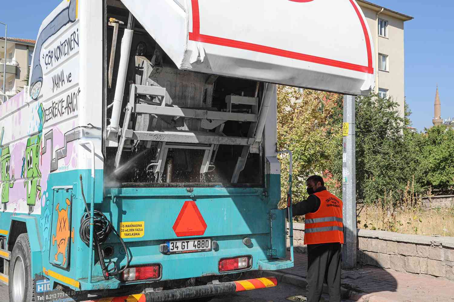 Çöp konteyneri yıkama aracını filosuna katan Talas Belediyesi, düzenli aralıklarla konteynerleri yıkayarak kötü kokuların ve virüslerin önüne geçiyor.