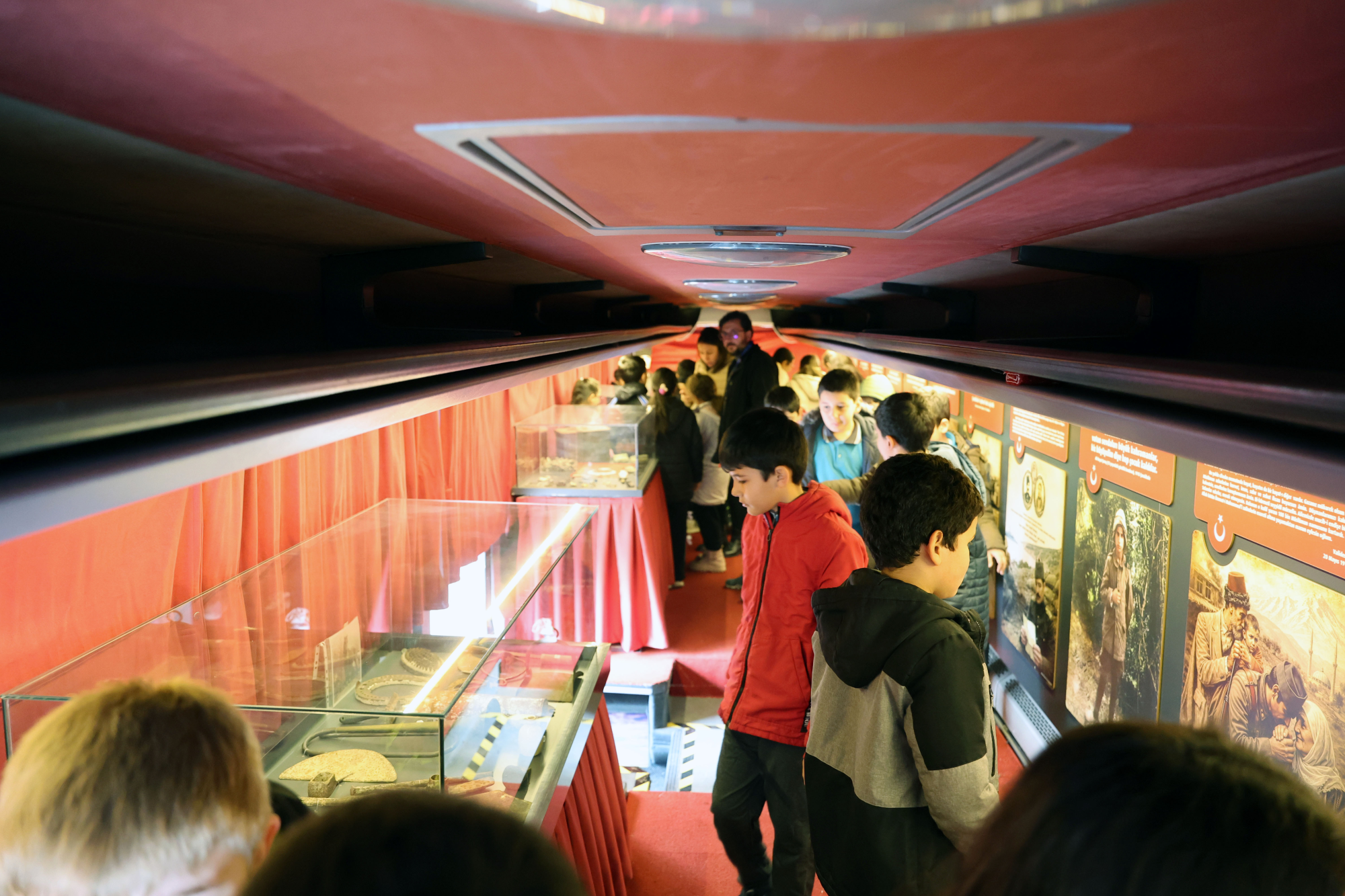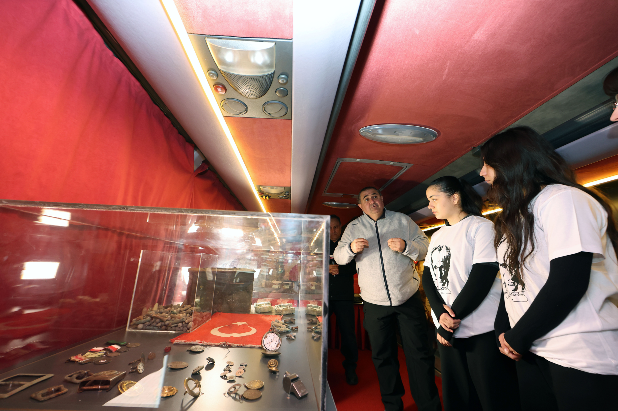 bahçelerine kurulan müze otobüslerini ziyaret eden öğrenciler, Çanakkale ruhunu