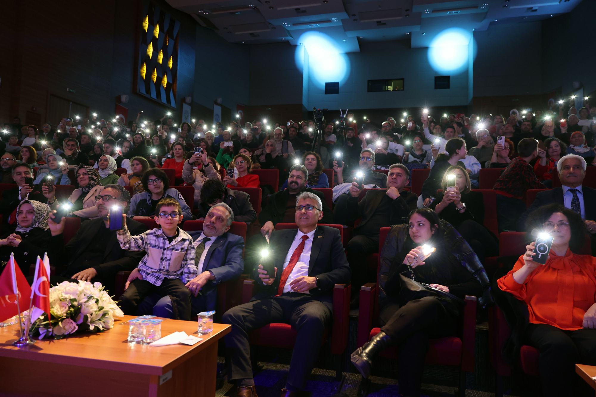 Yalçın’ın sözleri salonda büyük alkış alırken, program sonunda sanatçıya çiçek