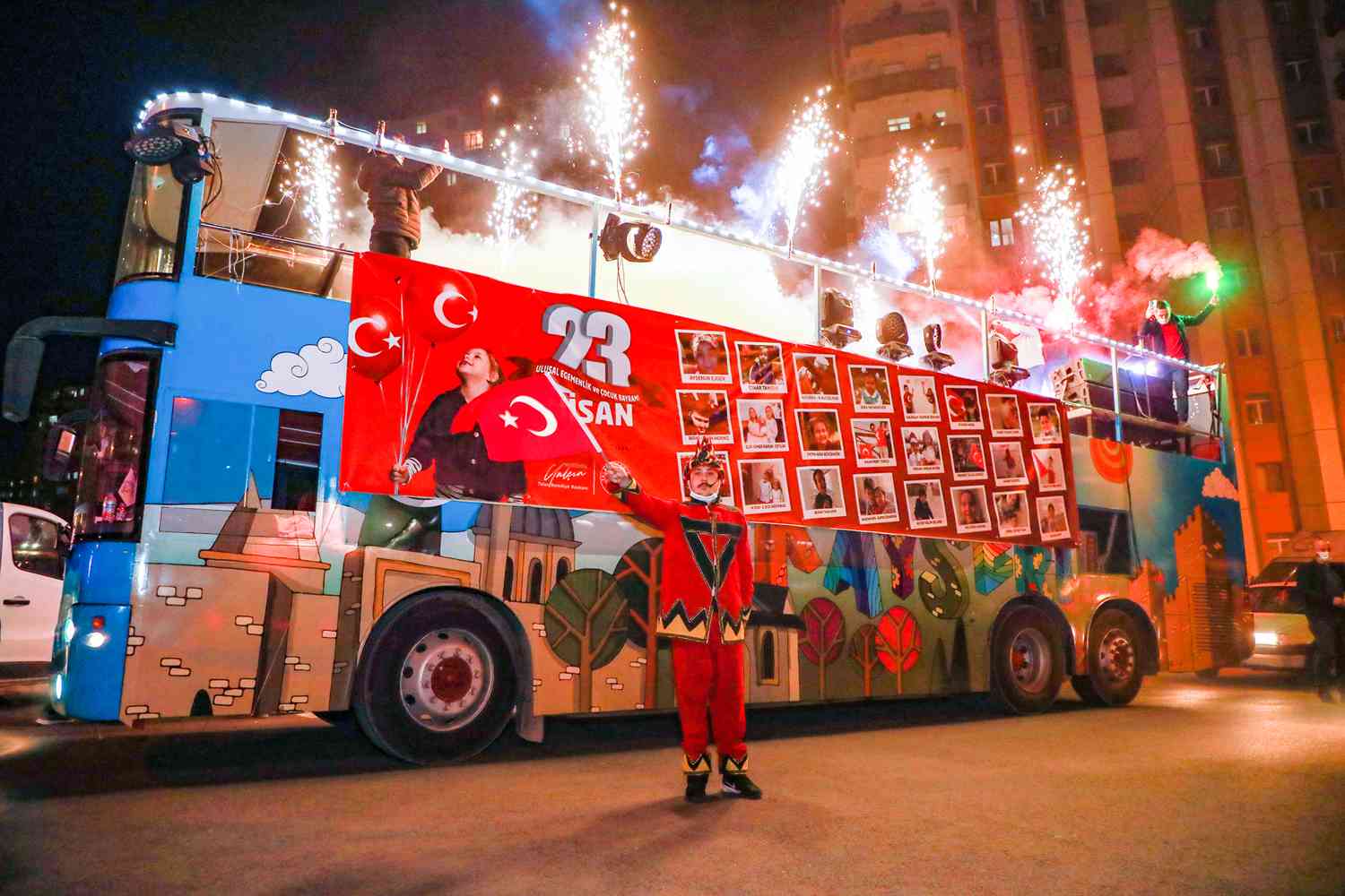 Belediyeye ait Maskot Bando takımının çaldığı birbirinden eğlenceli parçalara eşlik eden vatandaşlar, evlerinin balkonlarından bayraklar ve alkışlarla bu neşeye ortak oldu. Ayrıca otobüste bulunan Hacivat-Karagöz de çocukların ilgi odağı oldu.