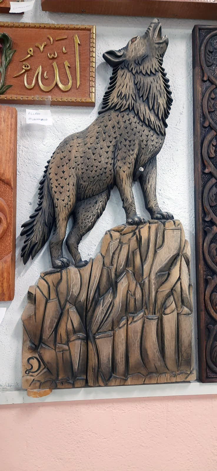 taş işlemeli rölyefi, ahşaptan oyulmuş bozkurt figürü ve taştan yapılmış